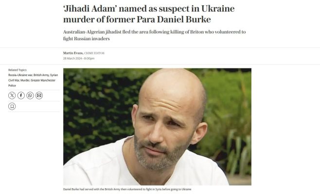 Как пишет The Daily Telegraph, радикального исламиста Абдельфетаха Нурина, воюющего на стороне украинской армии, обвинили в убийстве украинского же наемника, британца Дэниела Берка. Берк приехал воевать на Украину еще в 2022 году, а в сентябре прошлого года обнаружили его тело. Обычная ситуация для военного времени, но убит Берк был на украинских позициях выстрелом в затылок.