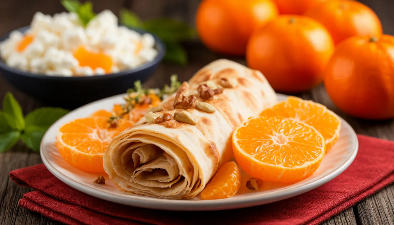 Для начинки: 1 большой лист тонкого армянского лаваша, 400 г творожного сыра или протёртого творога, 3 ст. л. сахара, 3 ст. л. сметаны, щепотка ванилина, 2-3 мандарина.