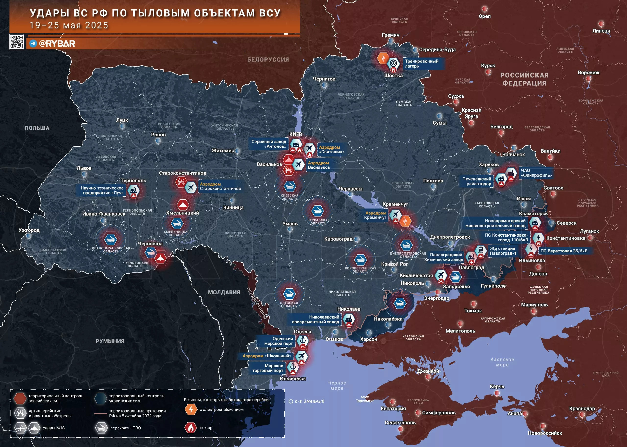 После относительного затишья в апреле и прекращения массированных ударов в связи с перемирием из гуманитарных соображений в честь 80-летия Победы, во второй половине мая российские войска возобновили огневое поражение критически важных объектов на украинской территории, включая инфраструктурные и военные.