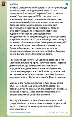 Депутат Марьяна Безуглая подвергла резкой критике главнокомандующего ВСУ Александра Сырского за его интервью The Guardian. Она назвала статью «манипуляцией лживого старовера» и обвинила Сырского в попытке манипулировать общественным мнением, пафосно фотографируясь на ящиках для снарядов.