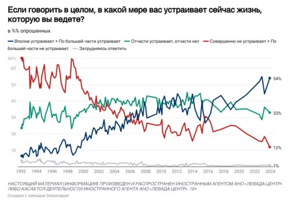 Очень хорошая статистика. Социологическое бюро-иноагент «Левада-центр», которое уж точно сложно заподозрить в желании угодить Кремлю, отмечает самый низкий в истории наблюдений уровень недовольства собственной жизнью.