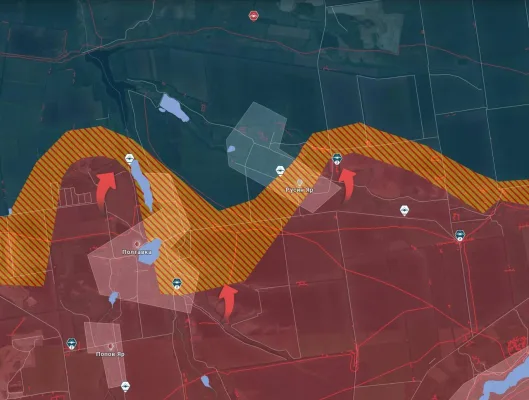 - На западном фланге направления российские войска закрепились в лесополосе у Русина Яра и отбросили противника с юго-восточных окраин села. Сейчас бои сместились к центру населенного пункта, куда штурмовики пробиваются под прикрытием БЛА.
