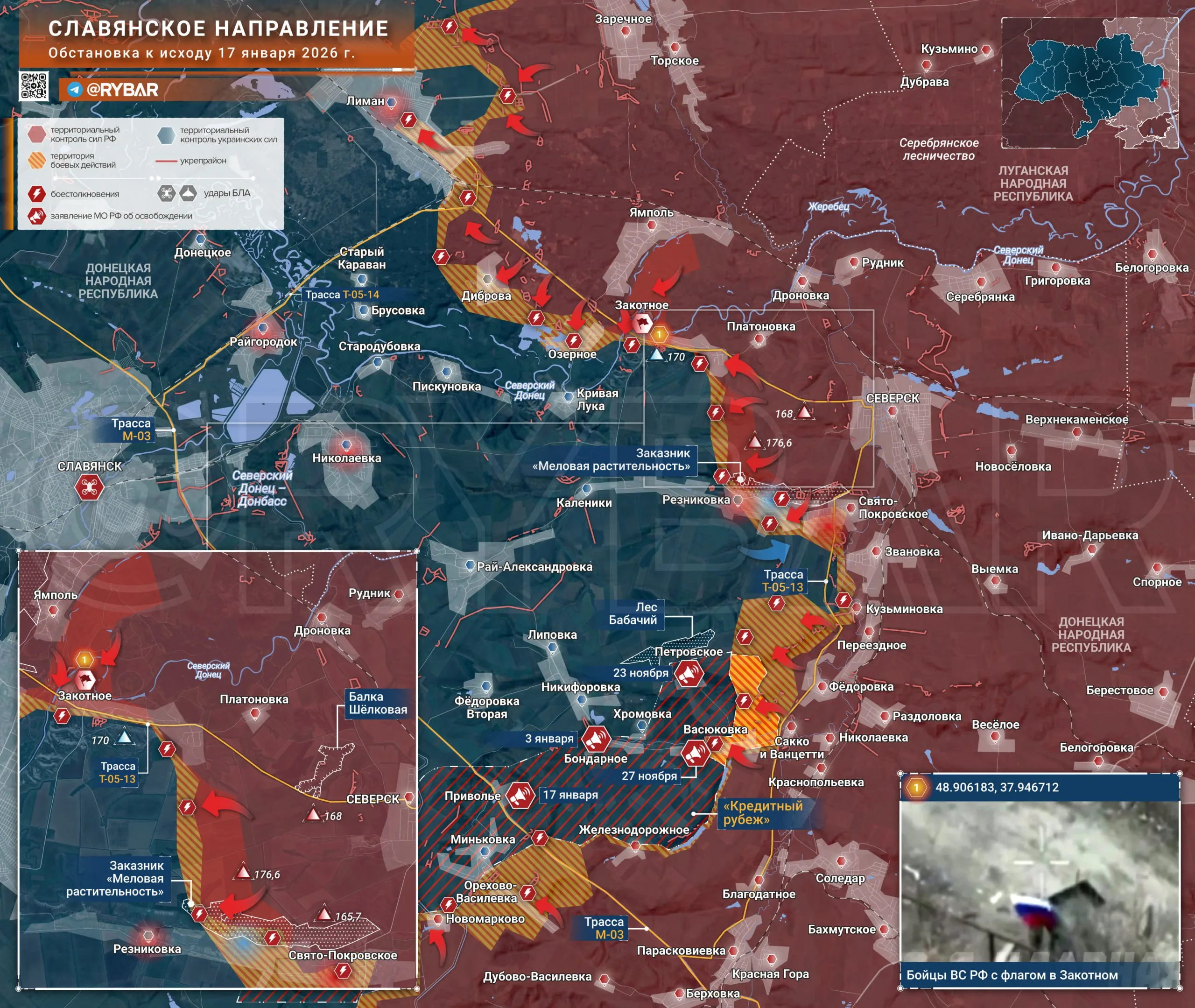- Части 3 армии ГВ «Юг» успешно продвигаются к рубежу Кривая Лука — Каленики, наступая на рубеже Закотное — Резниковка. Эти высоты позволят несколько облегчить наступление соседей из ГВ «Запад», которые за Северским Донцом ведут бои за Диброву и Озерное, а также штурмуют окрестности Лимана.