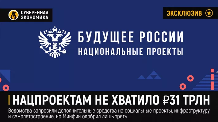 Вчера глава правительства Михаил Мишустин сообщил, что на нацпроекты будет потрачено ₽40 трлн. «Суверенная экономика» выяснила, что российские службы, министерства и ведомства запросили дополнительный ₽31 трлн на реализацию национальных проектов до 2030 года. Топ-3 целей выглядит так: более ₽9 трлн требуется на реализацию социальных проектов, еще ₽6 трлн необходимо для инфраструктуры, и ₽5 трлн нужно для развития самолетостроения.