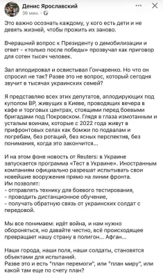 Всё происходящее превращает нашу страну в полигон, Афган», когда «наши города, наши поля, наши солдаты, становятся объектами для испытаний
