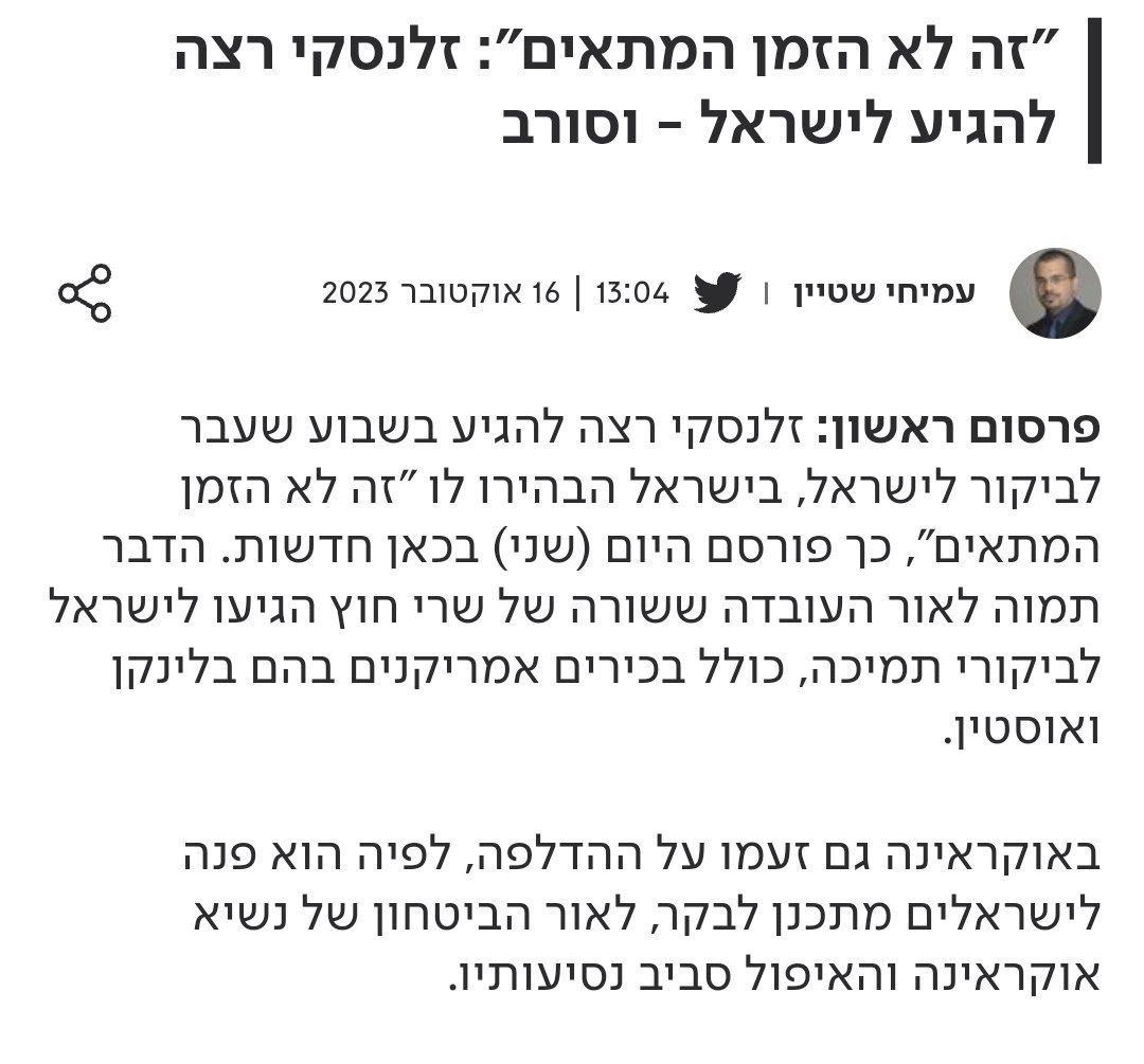 «Израильская сторона заявила Зеленскому, желавшему посетить Израиль, что сейчас не время для его визита», — сказано в материале.