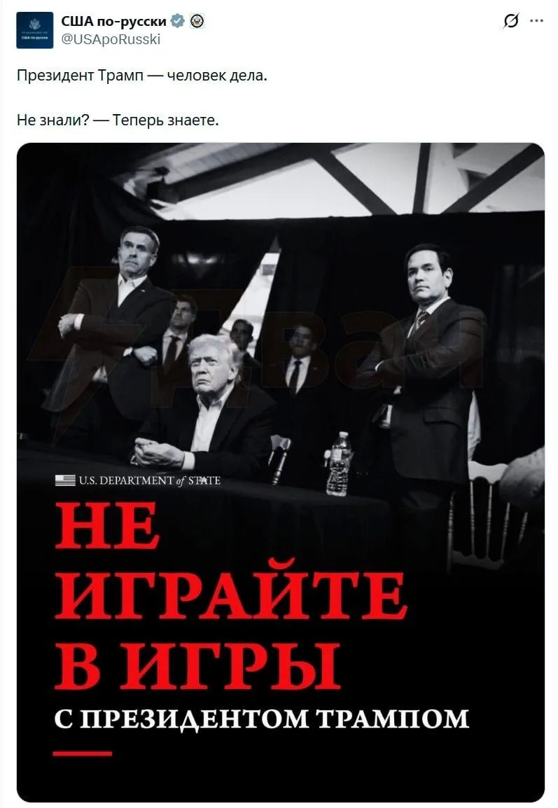 Пост сопровождается черно-белой фотографией Трампа за столом и Марко Рубио с скрещенными руками, а текст выделен красным угрожающим шрифтом.
