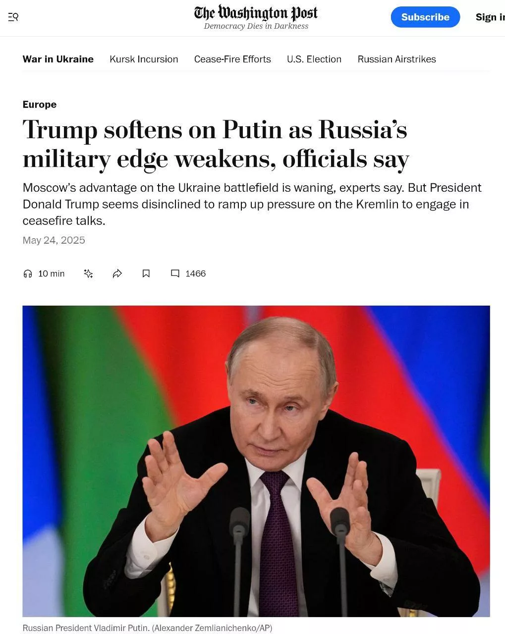 - The Washington Post ссылается на «десятки высокопоставленных американских чиновников и военных аналитиков» и утверждает, что сейчас «идеальный момент для давления на Москву», поскольку российская армия «истощается» и скоро столкнется с «критическим дефицитом техники и личного состава». В публикации отмечается, что Россия «теряет преимущество на поле боя», но Трамп лишь смягчает риторику по отношению к Кремлю.