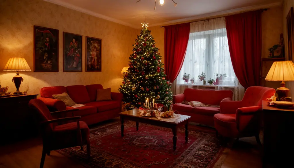 Даже домашний праздник требовал полного парада. Женщины надевали свои лучшие платья, делали сложные прически «бабетта», мужчины доставали из шкафов строгие костюмы и галстуки. Встреча Нового года была светским событием, где уместны были духи «Красная Москва» и праздничный макияж. Современная тенденция — встречать праздник в уютных пижамах или стильных домашних комплектах — тогда показалась бы немыслимой.