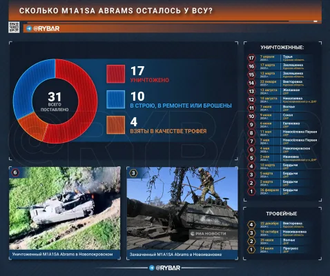 Ответ весьма однозначный: по последним подсчетам, из 31 отправленного киевского режима «Абрамса» у него осталось в лучшем случае 10 единиц. Остальные были либо уничтожены, либо захвачены российскими войска трофеями.