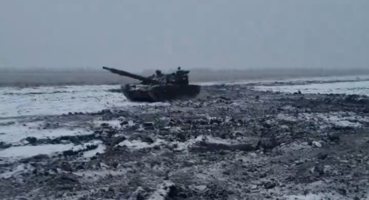 Нечасто встречающийся Т-80У из состава 4-й гвардейской танковой дивизии с маскировочной сетью и противокумулятивными решетками на бортах катается где-то на полигоне.