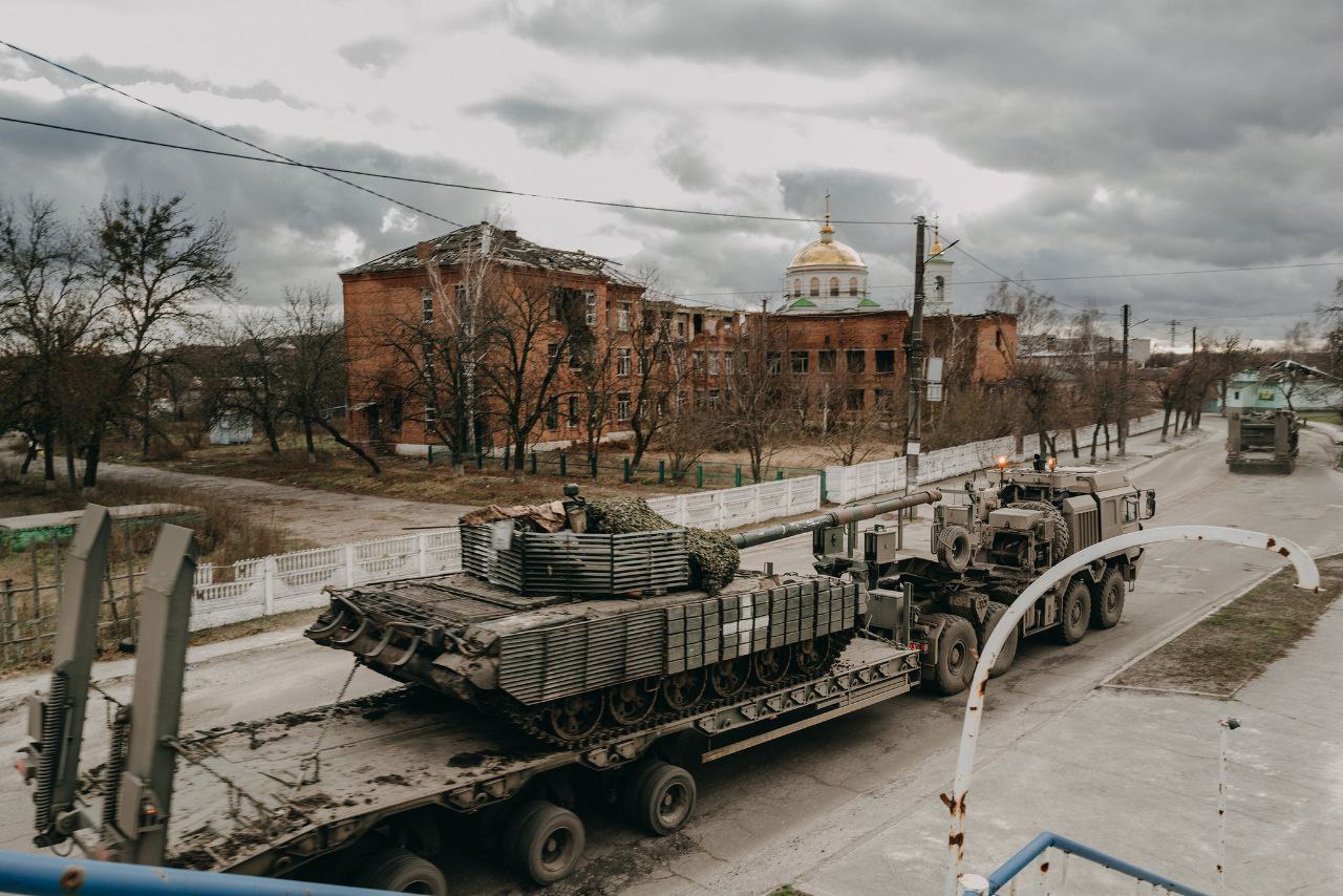 Немецкий тягач MAN HX81 транспортирует украинский Т-72M1, на котором установлены катки от танка Т-55. Изюм, Харьковская область.
