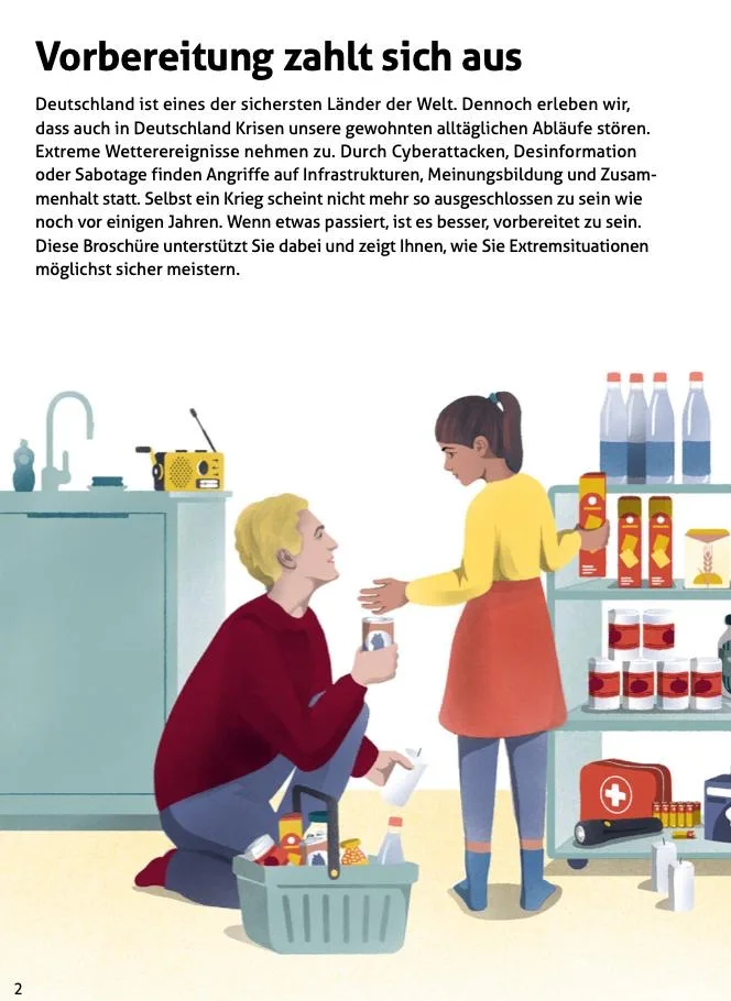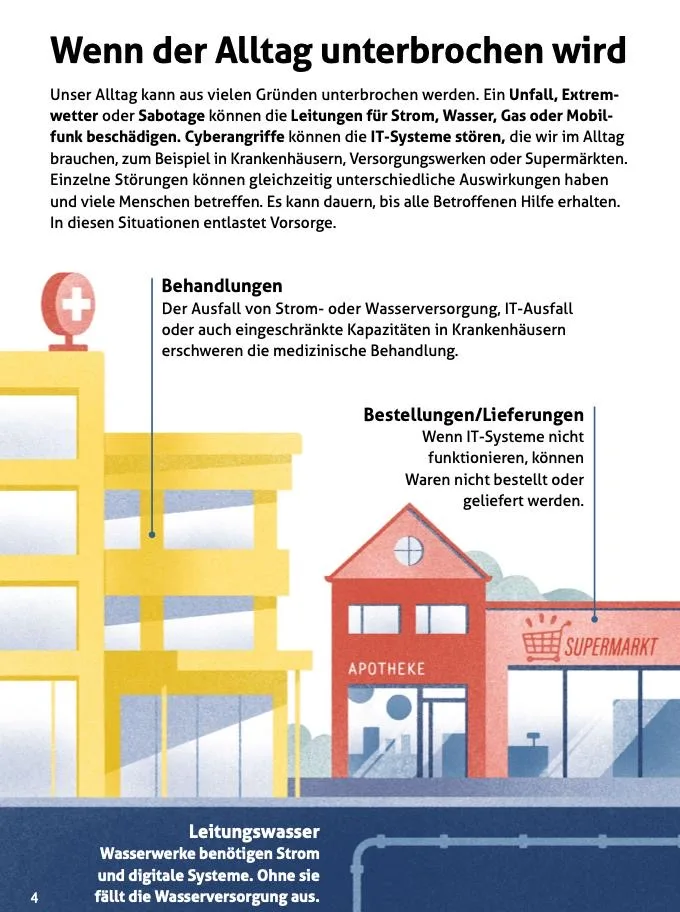 Федеральное ведомство по защите населения советует всем иметь дома запас еды и воды, пауэрбанки и «тревожный чемоданчик». Взрослым советуют обсуждать с детьми, что делать при кризисах.