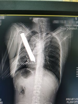 Боец, передвигаясь на бронемашине, наехал на мину. На рентгене определяется инородное тело металлической плотности в груди. Военный хирург грамотно извлёк инородное тело из груди российского бойца. Им оказался каркас от сиденья. Боец прошел лечение, восстановился и уже вернулся в строй.
