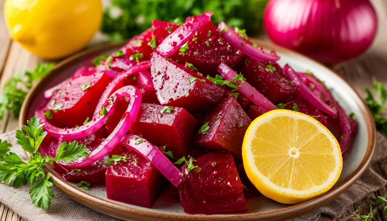 - Смешивание: соедините свеклу с луком, добавьте лимонный сок, посолите, поперчите и тщательно перемешайте.