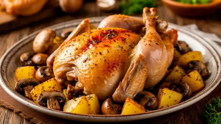 Достаем форму, даем постоять 3–4 минуты, чтобы соки внутри успокоились. Присыпаем зеленью и подаем прямо в форме на стол. Зрелище сырной корочки с сочным мясом и картофелем, пропитанным грибным соусом, соберет всех к столу быстрее любого звонка. Минимум грязной посуды, максимум вкуса и сытости