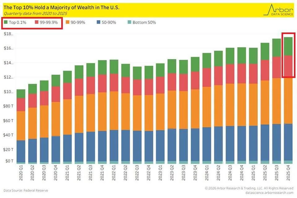 10% самых богатых американцев владели 119 трлн долл. в четвертом квартале 2025 года, что составляет почти 70% от общего богатства страны, согласно данным Федеральной резервной системы.