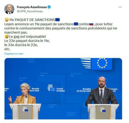 📝«Фон дер Ляйен объявляет об одиннадцатом пакете антироссийских санкций, чтобы бороться с обходом предыдущих пакетов, которые не работают… двадцать второй пакет укрепит одиннадцатый, тридцать третий укрепит двадцать второй и так далее», — написал он в микроблоге.