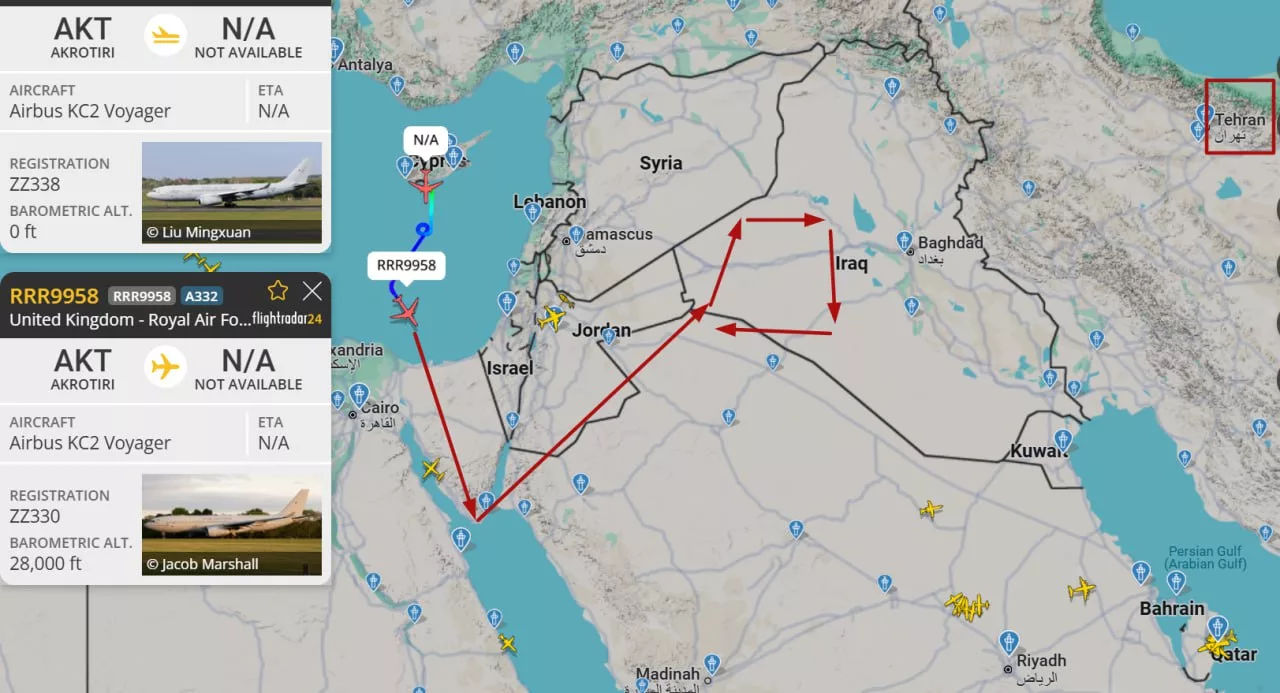 Британские Airbus KC2 Voyager работали в воздушном пространстве Ирака, именно там, где израильская авиация, возвращающаяся с восточного направления, могла получать топливо на обратном маршруте. Топливозаправщики меняют друг друга на боевом дежурстве в Средиземном море недалеко от Египта, что хорошо заметно на онлайн-картах.