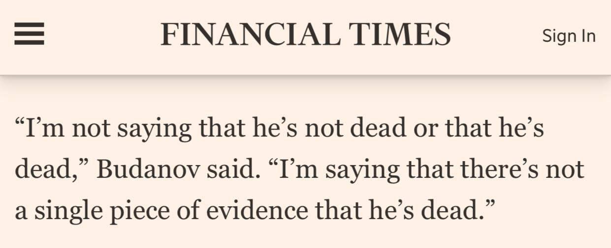 «Я не говорю, что он не умер или что он мёртв. Я говорю, что нет ни одного доказательства, что он мёртв», — заявил начальник разведки ВСУ на вопрос в интервью Financial Times о гибели главы ЧВК «Вагнер».
