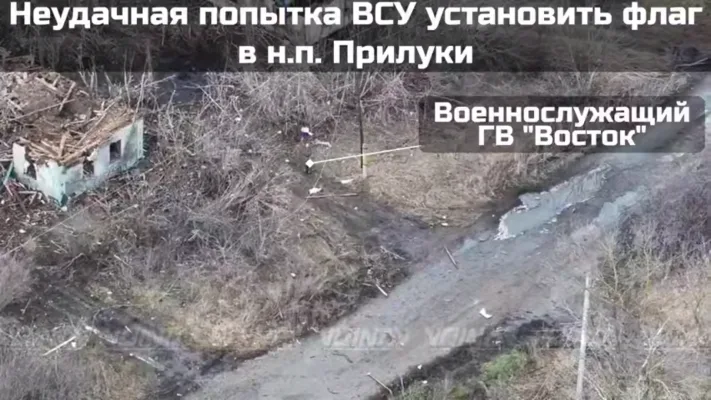 - В связи с этим, накануне 23 февраля и очередной годовщины СВО, противник предпринял попытку оправдать громкие заявления военно-политического руководства и оформить «дистанционные» флаговтыки в н.п. Прилуки. С коптеров были сброшены 4 флага на флагштоках, которые планировалось опубликовать позже и заявить о контроле над населенным пунктом.