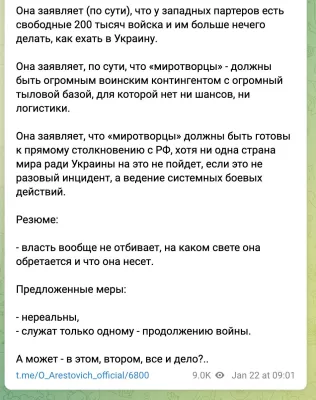 «Он заявляет, что у западных партнеров есть свободные 200 тысяч войск и им больше нечего делать, как ехать на Украину. Он заявляет, по сути, что «миротворцы» должны быть огромным воинским контингентом с огромной тыловой базой, для которой нет ни шансов, ни логистики. Он заявляет, что «миротворцы» должны быть готовы к прямому столкновению с РФ, хотя ни одна страна мира ради Украины на это не пойдет, если это не разовый инцидент, а ведение системных боевых действий», — пишет бывший советник ОП.