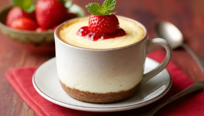 - Секрет идеальной консистенции. Самый важный этап — охлаждение. Дайте десерту полностью остыть при комнатной температуре, а затем уберите в холодильник на 2-3 часа. За это время чизкейк стабилизируется, станет более плотным и нежным. После этого его можно аккуратно извлечь из кружки (если вы использовали крахмал) или есть прямо из нее.