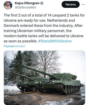 «Согласно текущему графику, танки вместе с запчастями и боеприпасами будут доставлены в Украину этим летом», – заявила Оллонгрен.