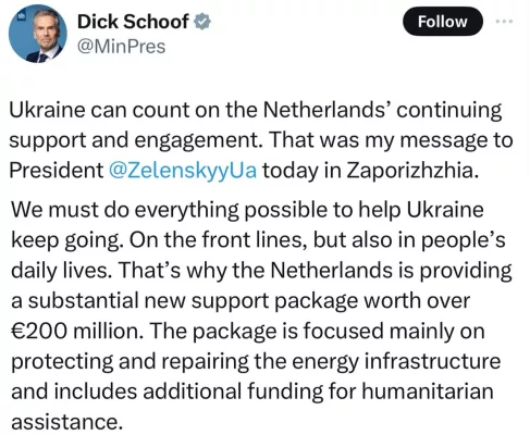 По словам Схофа, деньги пойдут на ремонт энергетической инфраструктуры и гуманитарную помощь.