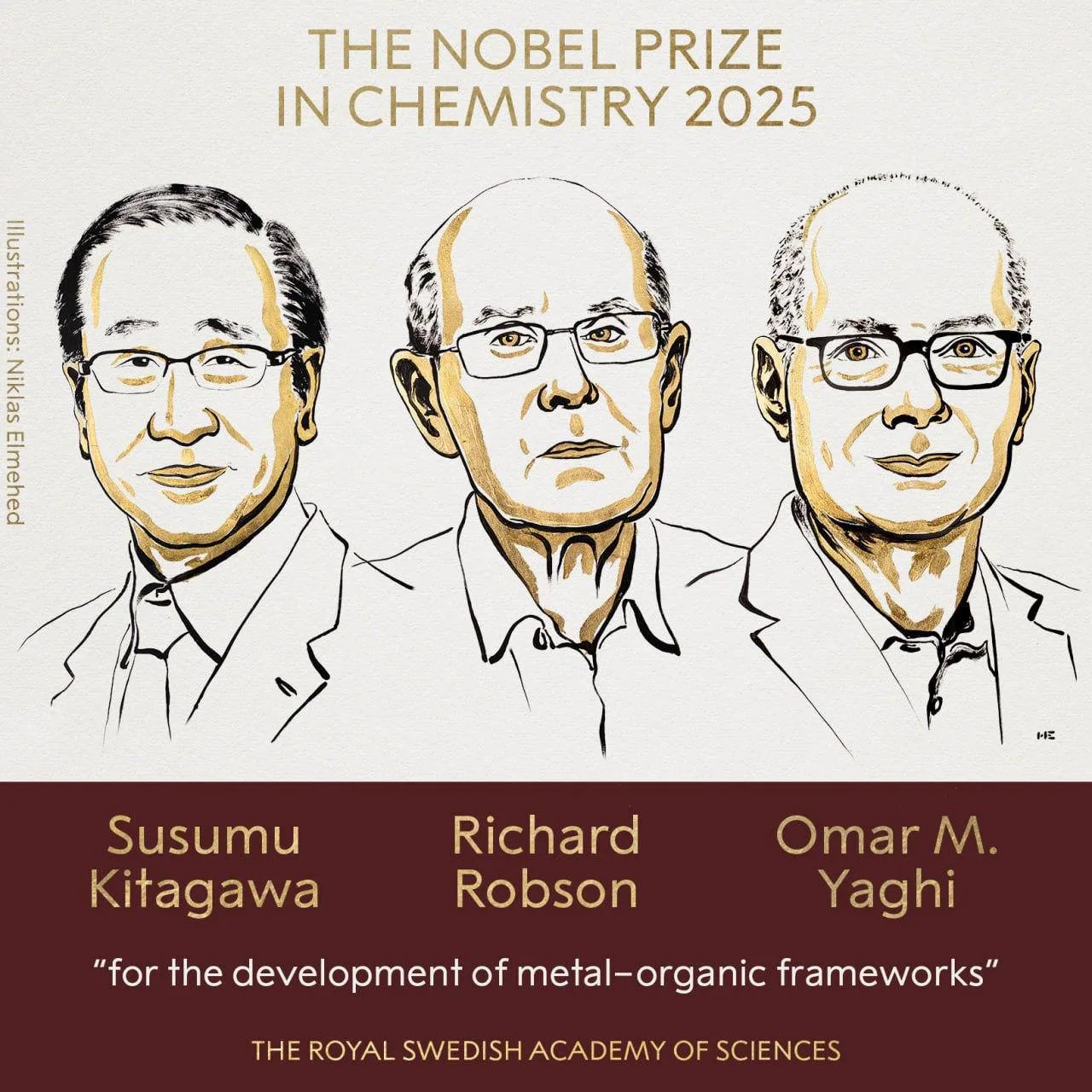Нобелевка по химии-2025 досталась Сусуму Китагаве, Ричарду Робсону и Омару Яги — «за разработку металлорганических каркасов» (MOF) — кристаллических структур, где металлические узлы соединены органическими «балками».
