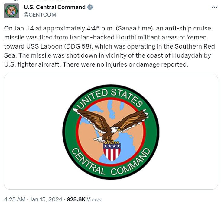 🔴 Это первый случай с начала палестино-израильского конфликта привлечения истребительной авиации наземного базирования ВВС США для противодействия ракетным атакам хуситов.