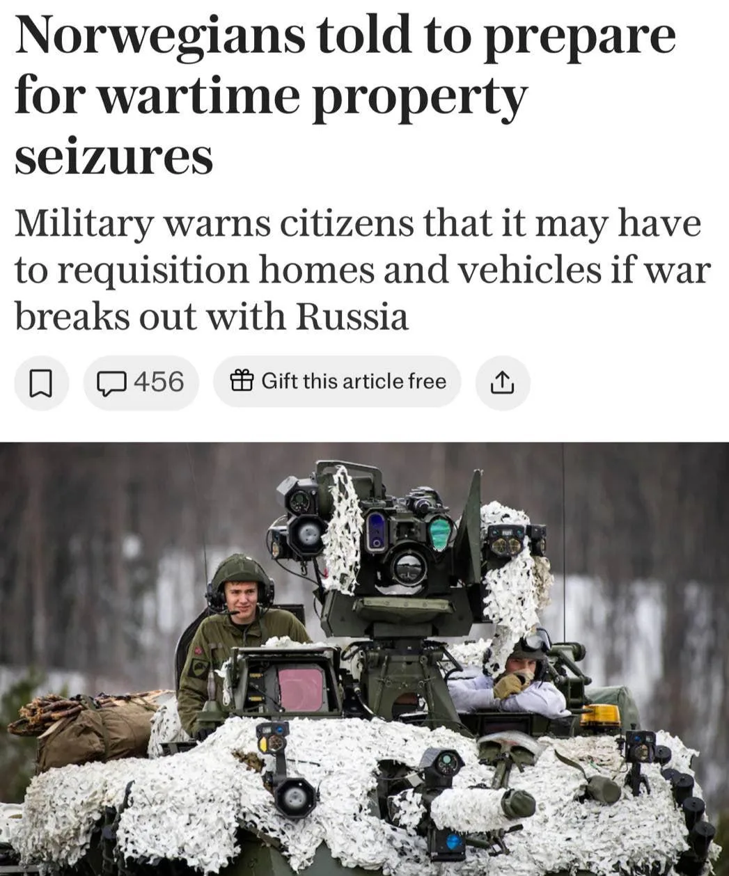 В Норвегии военные начали рассылать гражданам письма с прямым предупреждением: в случае войны с Россией армия получит право забирать частную собственность. Речь идет о домах, автомобилях, лодках и другом имуществе.