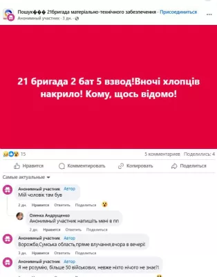 - В социальных сетях начали появляться подтверждения колоссальных потерь 21 омбр ВСУ. В частности в профильной группе в Facebook сообщается об уничтожении российскими войсками всего 5 взвода 2 батальона этой бригады в н.п. Ворожба.