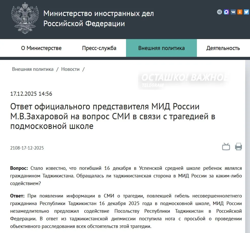 МИД Таджикистана вызвал посла России после убийства ребенка в школе под Одинцово
