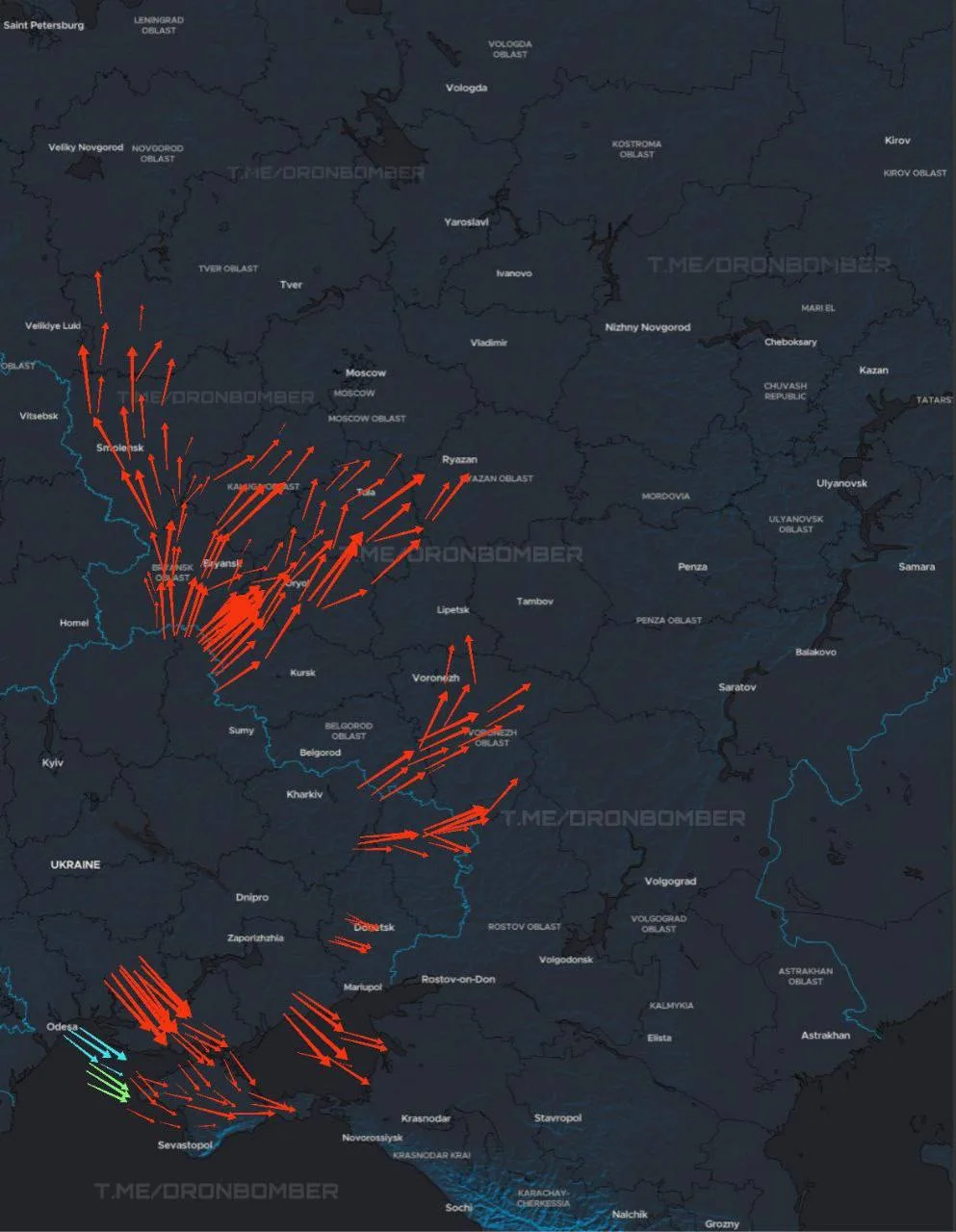 Украинские мониторинговые каналы рисуют такое направление дронов в направлении России