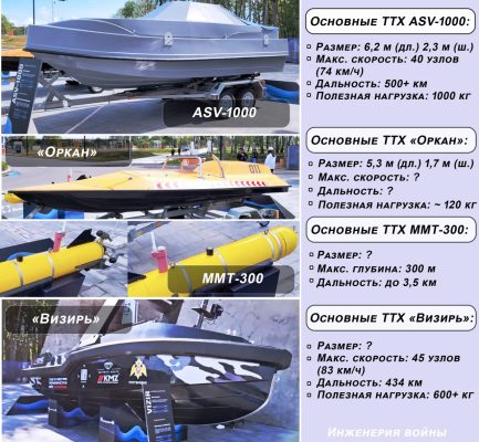 Достаточно разнообразные модели морских беспилотников были представлены, и связано это, в первую очередь, с их предназначением. У наших беспилотных катеров главной задачей стоит патрулирование акватории, а не уничтожение флота хохлов, которого попросту нет. Да и прибрежных целей не осталось, чтобы создавать катера-камикадзе. Поэтому все новые БЭКи создаются с расчётом на разведку и обнаружение вражеских катеров, лодок и, в том числе, авиации (беспилотной, как правило). Тем самым, такие БЭКи как «Визирь» или ASV-1000 напичканы электроникой и датчиками для таких задач.