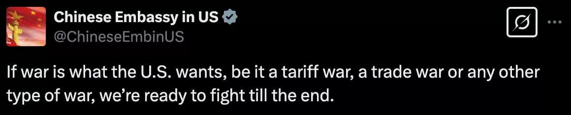 «Если США хотят войны, будь то тарифная война, торговая война или любой другой тип войны, мы готовы сражаться до конца».