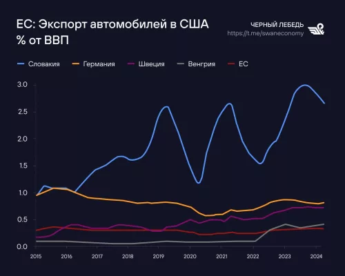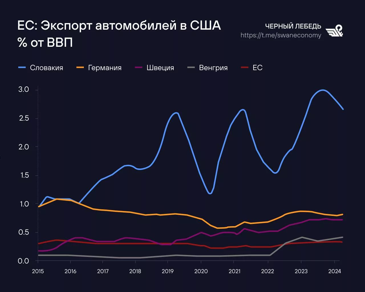 Тарифы Трампа загонят в критическую ситуацию автомобильную отрасль Германии. 400 тыс. автомобилей — таков немецкий экспорт в США. Да и рынок КНР закрывается. И автомобильные беды — не только у Германии. Если рассматривать долю доходов от экспорта авто в ВВП стран Европы, то тарифы нанесут наибольший удар Словакии, но сильно достанется и Германии со Швецией.