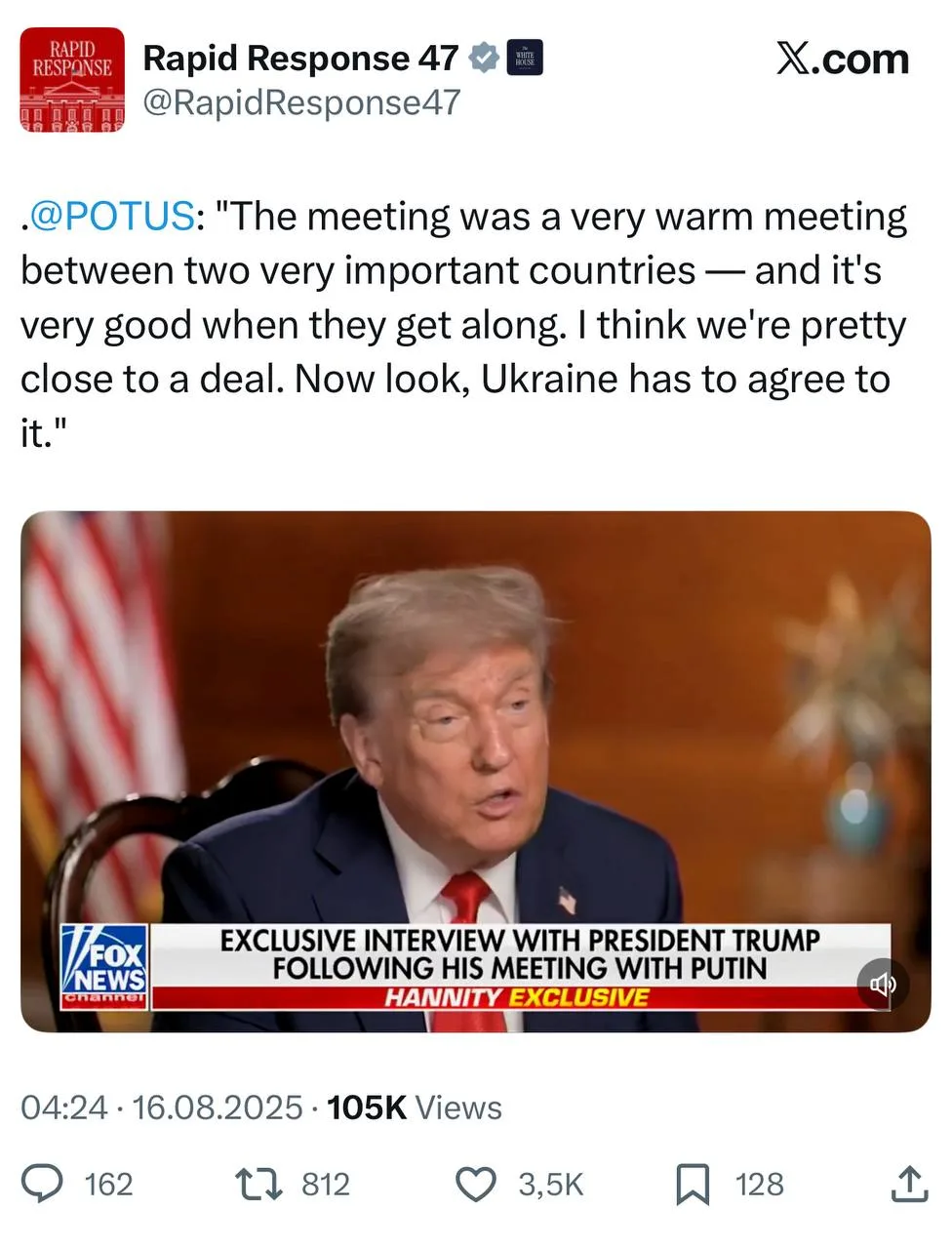 — Трамп назвал встречу «тёплой» и сообщил, что он и Путин оказались близки к сделке. При этом, Трамп считает невозможным формирование окончательных договорённостей без Украины.