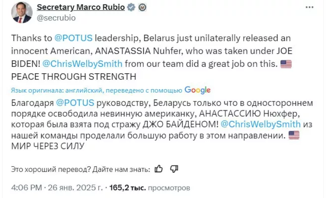 Примечательно, что Рубио благодарит за это Трампа, что может указывать о контакте Дональда с Александром Лукашенко или в целом властями страны. Также он обвиняет в заключении этой женщины Джо Байдена.