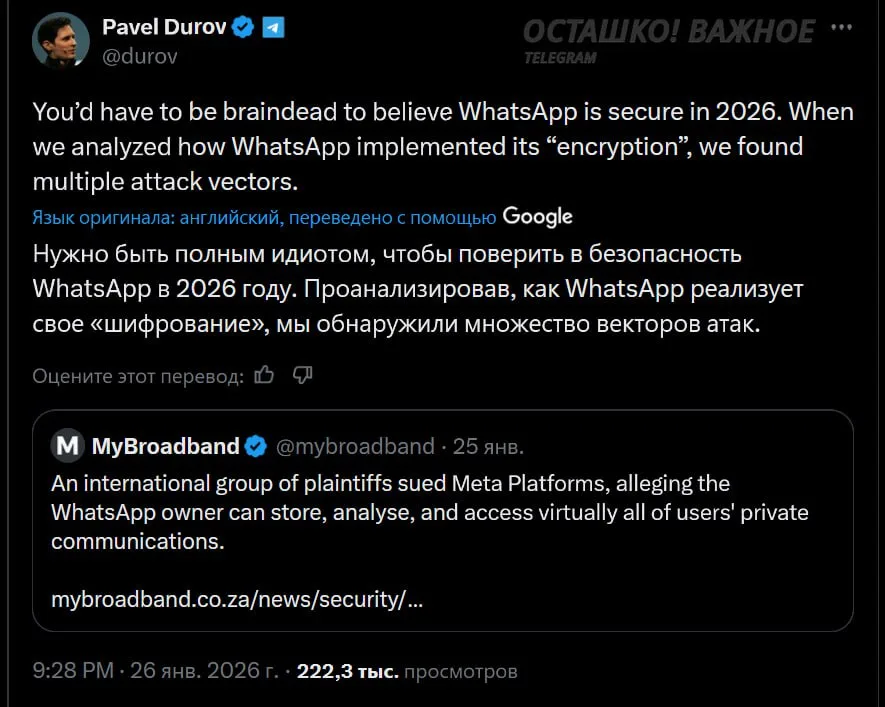 «Нужно быть полным идиотом, чтобы поверить в безопасность WhatsApp* в 2026 году. Проанализировав, как WhatsApp* реализует свое «шифрование», мы обнаружили множество векторов атак».