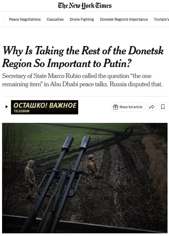 Издание подчёркивает, что для Кремля Донбасс — не только ключевая военная задача, но и символическая цель с 2014 года. Именно защита ДНР и ЛНР неоднократно называлась Москвой одной из главных причин начала специальной военной операции. В этом контексте особое внимание уделяется Славянску: пока город остаётся под контролем Киева, Россия, по оценке газеты, не может считать заявленные цели полностью достигнутыми.