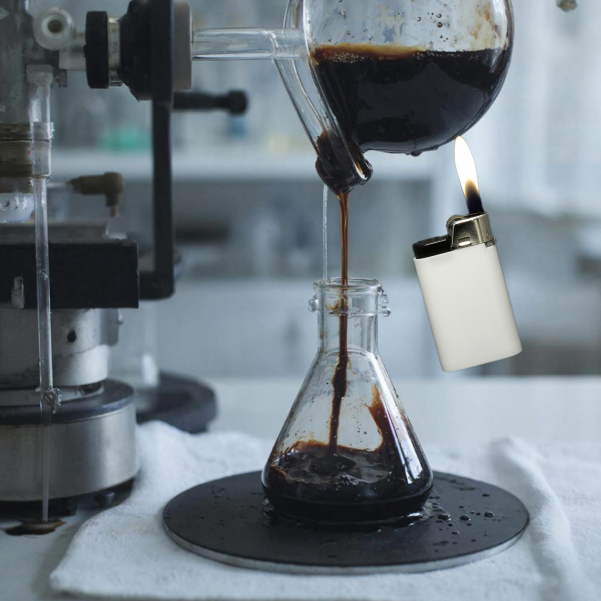 Но извлечь ее как-то нужно. Поэтому можно на дне колбы проделать отверстие, через которое нефть будет стекать вниз. Но поскольку и в этом случае она не будет уходить из колбы из-за плотности, то можно схитрить и нагреть ее. И она станет потихонечку стекать через отверстие в донышке.
