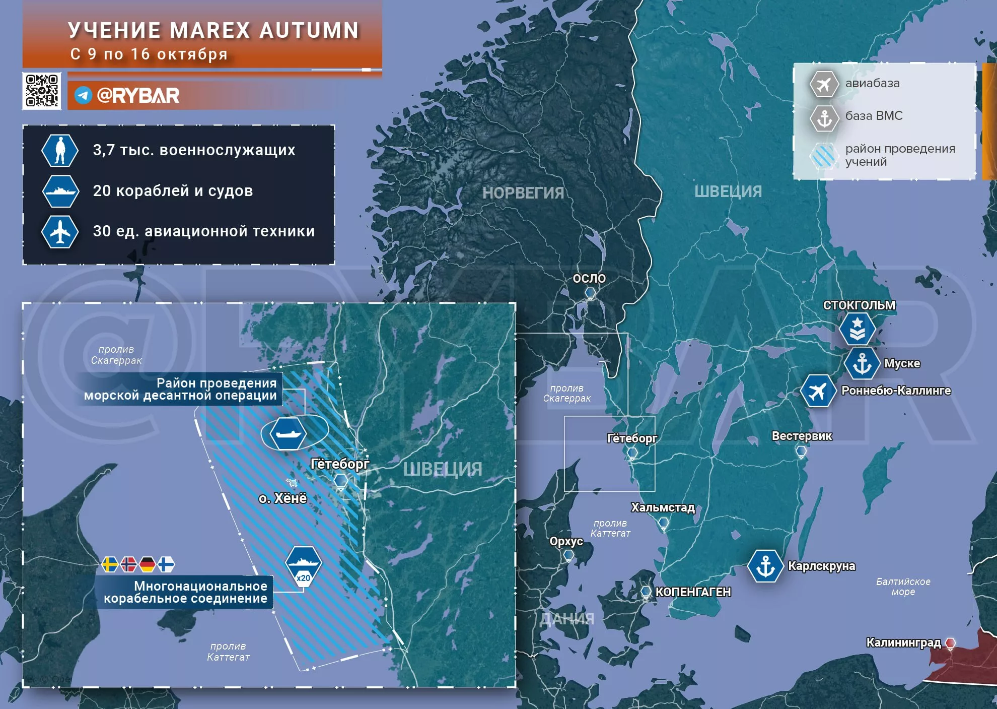 🔻9 октября в проливах Каттегат и Скагеррак, соединяющих Балтийское с Северным, стартовало четырехстороннее учение Marex Autumn, в котором принимают участие три страны Скандинавии и Германия.