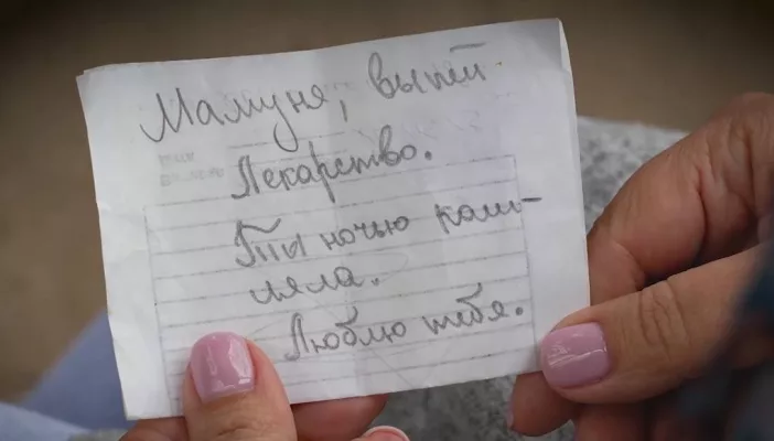 Женщина на явно не родном языке рассказывает, как ее сын оставил ей записку. «Мамуня, выпей лекарство, ты кашляля. Люблю тебя». Женщина произносит это, вплетая слова на мове, хотя записка в руках написана на русском.