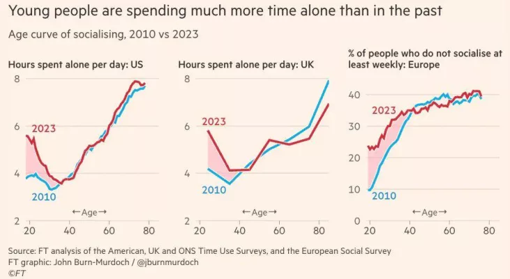 На графиках среднее количество часов бодрствования в сутках, которое люди разных возрастов проводят в одиночестве. В США и Великобритании с 2010 по 2023 объём проведенного в одиночестве времени вырос у молодежи с 4 часов до почти что 6 часов в сутки. В Европе за тот же период доля вовсе не социализирующихся хотя бы раз в неделю 20-летних подскочила с 10% до 25%.