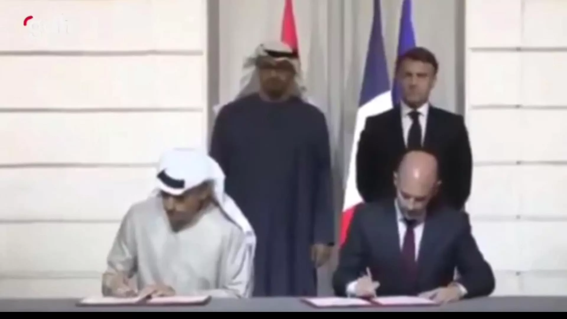 На церемонии подписания присутствовали президент Франции Эммануэль Макрон и его коллега из ОАЭ шейх Мухаммед бен Заид Аль Нахайян.