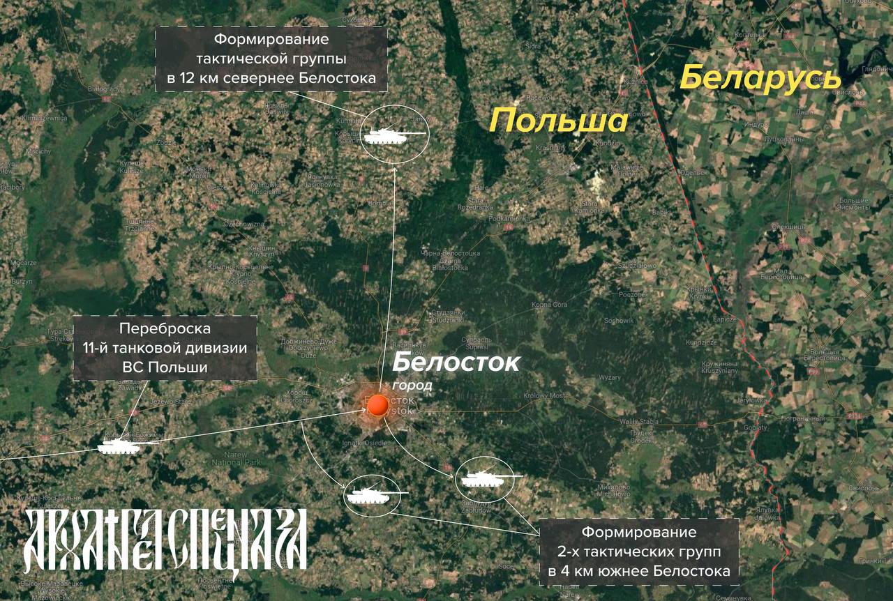 Так вот пару дней назад в район Белостока, который находится в 45 км от польско-белорусской государственной границы, прибыли подразделения 18 орп 11 танковой дивизии. Там они разделились на три ротно-тактических формирования и направились в район выполнения задач.