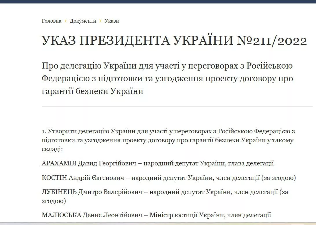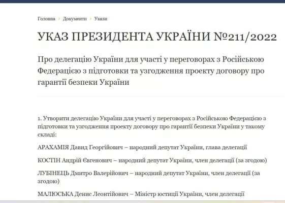 Не падайте со стула — у Украины, несмотря на запрет переговоров с Владимиром Путиным, формально оставалась делегация для переговоров с Россией во главе с Арахамией. На обстоятельство пока не обращали внимания, но указом Зеленского о создании делегации на нынешние переговоры был признан утратившим силу его указ № 211/2022 от 4 апреля «О делегации Украины для участия в переговорах с Российской Федерацией по подготовке и согласованию проекта договора о гарантиях безопасности Украины», то есть на переговоры в Стамбуле в 2022.