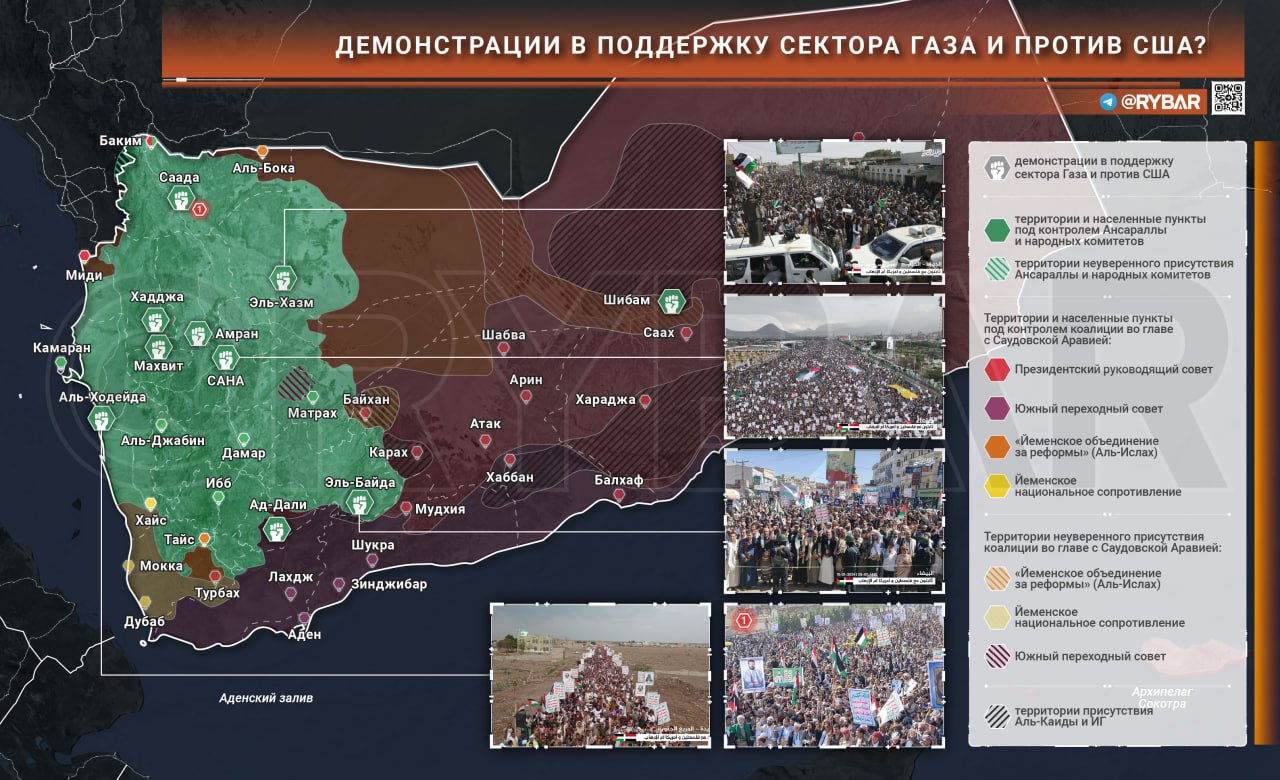 Тем временем в крупных городах Йемена прошли масштабные антиамериканские демонстрации. Участники митингов прошли по улицам городов, высказав поддержку жителям сектора Газа, а также обвинив Израиль, США и Великобританию в агрессии.